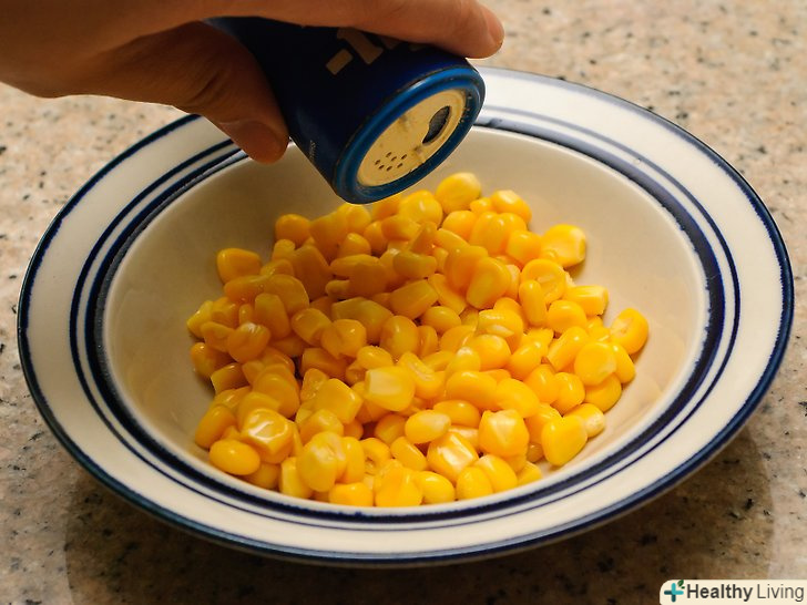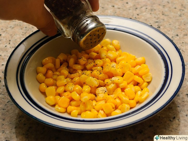Додайте сіль, перець і вершкове масло.приправте вашу кукурудзу, як тільки дістанете з мікрохвильової печі. Сіль і перець додасть солодкій кукурудзі пікантний смак, в той час як масло збереже вологу і додасть гладку текстуру.- Додавайте за бажанням сіль, перець і масло. Якщо ви не впевнені, додайте одну столову ложку масла на кожні 340 грам кукурудзи (еквівалент 1,5 чашки кукурудзяних зерен) і сіль з перцем за смаком.