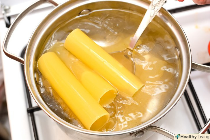 Попередньо розігрійте духовку до 400°F (204.4°C).у той час як духовка нагрівається, наповніть велику каструлю водою. Додайте дрібку солі і доведіть до кипіння. Ви не збираєтеся самостійно готувати трубочки з тіста, ваша мета-зробити їх трохи м'якше. Як тільки вода закипить, опустіть в неї трубочки з тіста. Варіть їх протягом декількох хвилин. Вони повинні стати трохи м'якше, але не втратити форму.- Ви можете також використовувати квадратні шматки макаронного тіста, а не традиційні трубочки з тіста. Їх теж треба злегка прогріти.