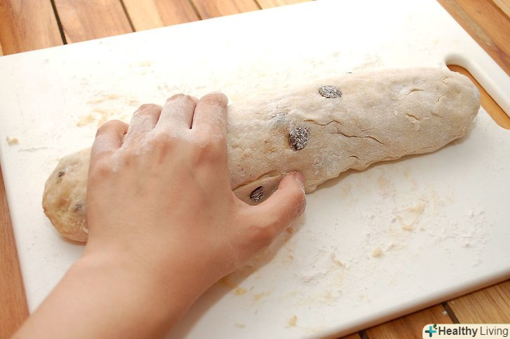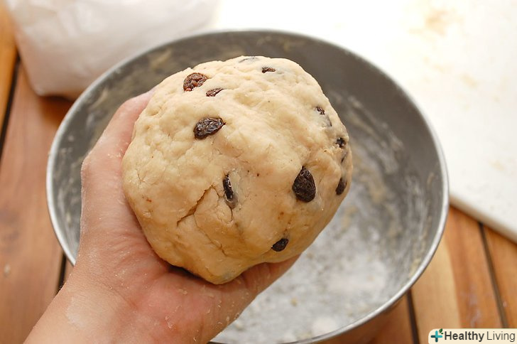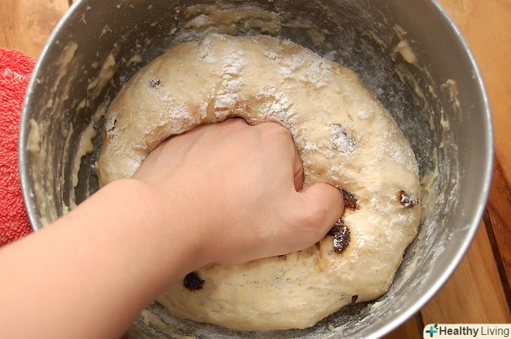 Продовжуйте роботу з тестом. Присипте робочу поверхню борошном. Дістаньте тісто з чаші. Якщо тісто липне до рук, додайте ще трохи борошна.- Вимішуйте тісто руками, поки воно не стане еластичним.