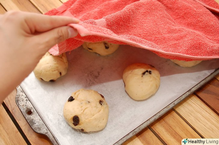 Як тільки тісто збільшиться в два рази, зніміть рушник.пензликом намажте булочки сумішшю яйця і води. Потім ножем зробіть в центрі кожної булочки хрест. Чим глибше буде розріз, тим чіткіше буде видно хрест на готових булочках.