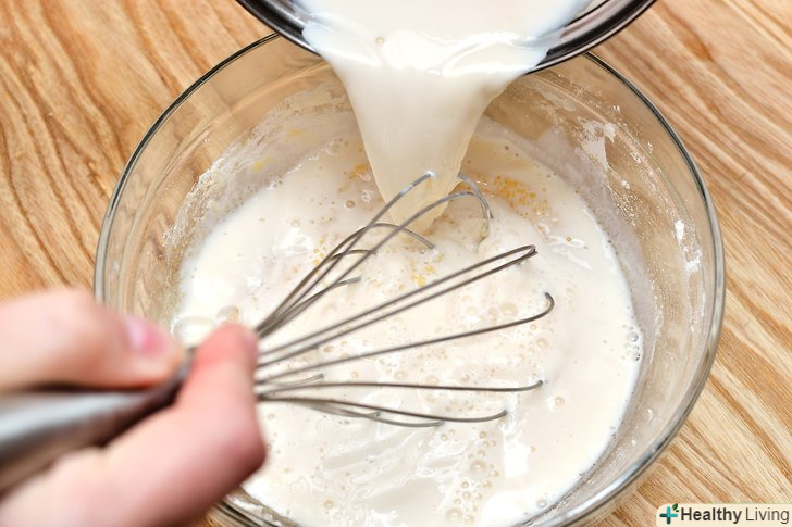 Додайте тепле молоко в яєчну масу.повільно вилийте молоко в яйця однією рукою, а іншою рукою постійно збивайте віночком вашу суміш. Коли ви закінчите лити молоко, перелийте суміш назад в цю миску і поставте її на плиту[1]- Цей процес стримує жовтки і не дозволяє їм зваритися від теплого молока.