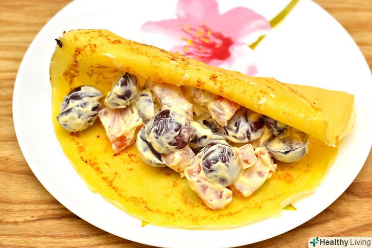 Подавайте млинці з шоколадною начинкою.це буде прекрасний десерт, а приготувати його дуже просто: розтопіть вершкове масло в сковороді, покладіть млинець і обсмажуйте на одній стороні протягом 45 секунд, потім переверніть. Посипте млинець шоколадною стружкою або шматочками темного шоколаду. Складіть навпіл, а потім ще раз навпіл. Покладіть млинець на тарілку і подавайте.- Подайте млинці з фруктовою начинкою.полуниця, персики, яблука і сливи в поєднанні з невеликою кількістю цукрової пудри є смачною начинкою для млинців. Ви можете використовувати свіжі або консервовані фрукти.