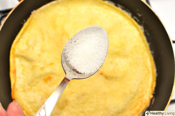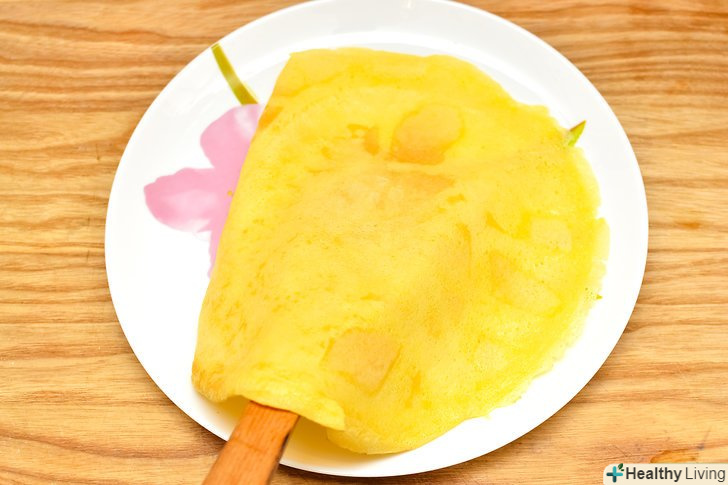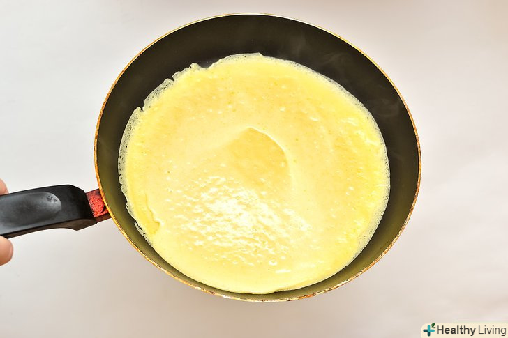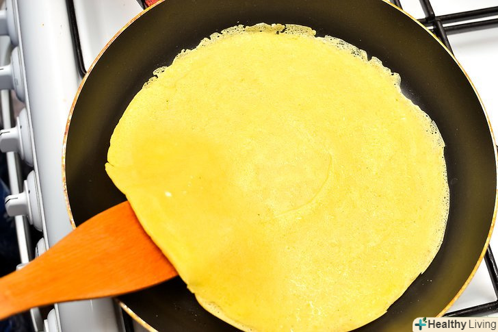 Підсмажте млинець.поставте сковороду назад на вогонь і дайте підсмажитися, поки верх не буде лише злегка вологий. Підніміть лопаткою млинець; він повинен легко підніматися і виглядати ажурно з іншого боку. Це означає, що пора його перевернути.- Якщо млинець все ще виглядає вологим посередині, дайте йому трохи більше часу.