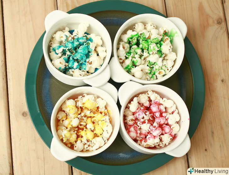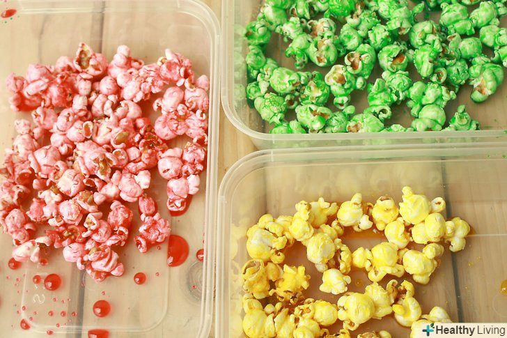 Повторіть те ж саме з іншими порціями попкорну і кольорової цукрової води.