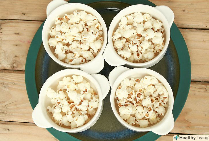 Розділіть готовий попкорн, розклавши в чисті миски, на стільки порцій, скільки у вас вийшло мисок з барвниками.