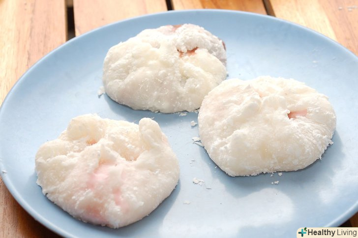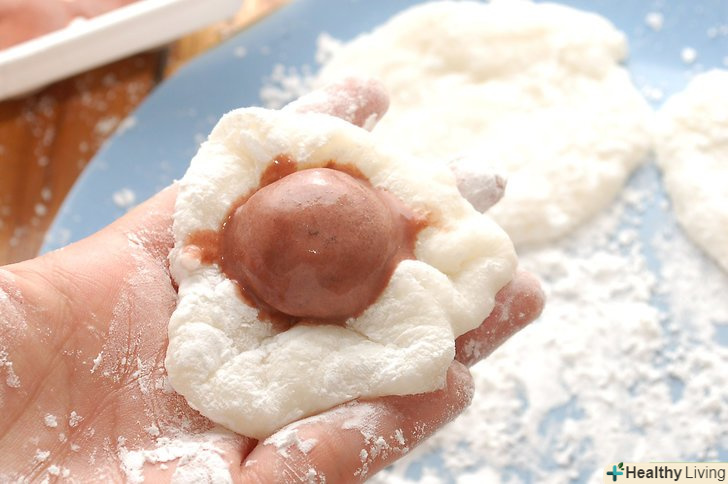 Візьміть одну частину тесту.розгладьте шматок у вашій долоні і оберніть його навколо кульки морозива. Повторіть цю процедуру з іншими шматочками Моті і морозива.