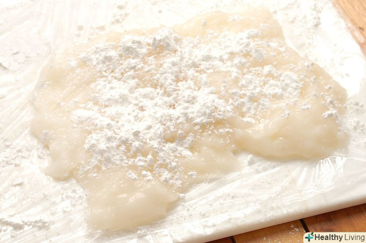 Потім розкиньте і обсипте дошку кукурудзяним крохмалем.забезпечте його достатню кількість, щоб тісто Моті не прилипало до поліетиленової плівки або дошки.
