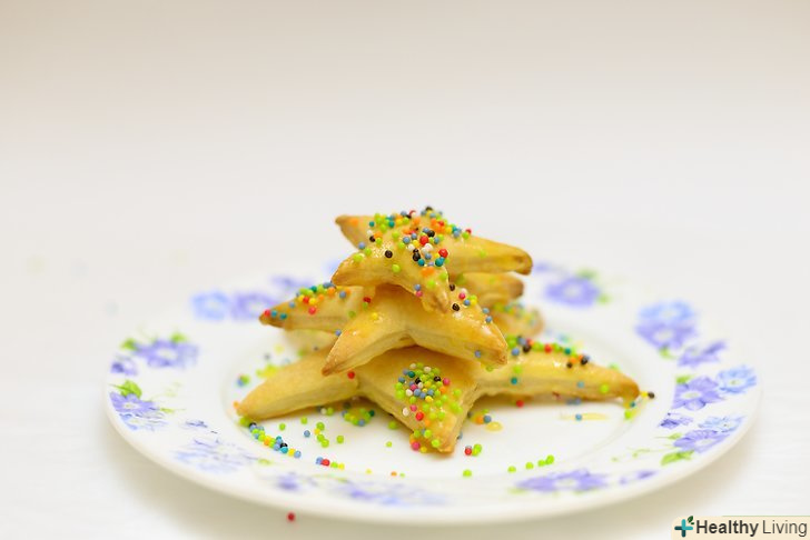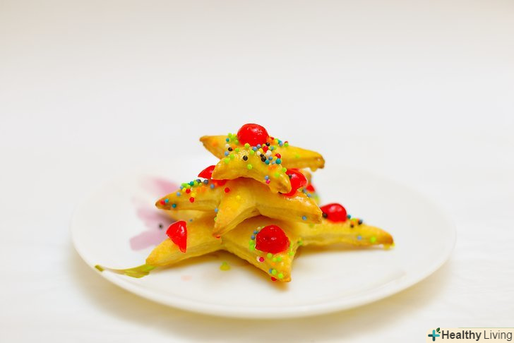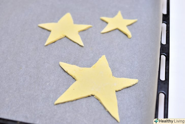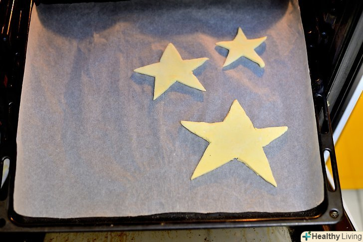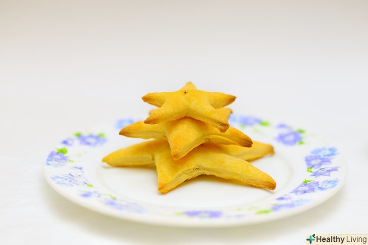 Розкачайте листкове тісто і виріжте зірки.посипте робочу поверхню невеликою кількістю борошна і розкладіть частину листкового тіста. За допомогою качалки розкачайте його. Візьміть три форми для печива у вигляді зірок різних розмірів. З їх допомогою виріжте чотири зірочки. Потім повторіть процес на іншому аркуші тесту.[2]- В результаті вийде чотири великих зірки, чотири середніх і чотири маленьких, з яких необхідно буде надалі створити дерева.