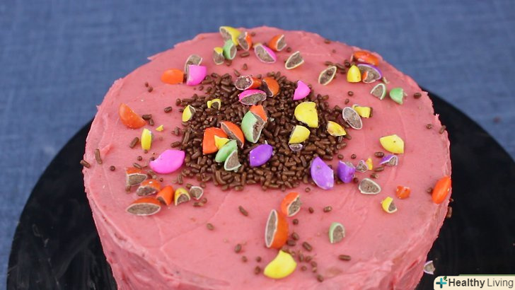 Покрийте торт чимось яскравим і хрустким. якщо ви хочете прикрасити шар глазурі і надати торту додатковий смак, додайте різнокольорову посипання, подрібнені горіхи, карамель, безе або цукерки. Якщо ви хочете прикрасити бічні сторони торта, акуратно втисніть в глазур інгредієнти, щоб вони пристали до неї.[11]- Посипте торт ірисом або цукровою пудрою, щоб додатково прикрасити його і створити хрустку скоринку.