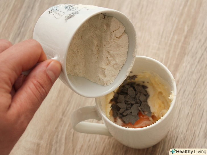 Додайте борошно і шоколадну крихту.всипте трохи менше ¼ склянки (40 грам) борошна і перемішайте суміш до однорідної консистенції. Додайте 2 повних столових ложки шоколадної крихти і знову перемішайте, щоб рівномірно розподілити її в чашці.[9]- Не їжте тісто для печива до моменту випікання, оскільки воно містить сирий яєчний жовток.