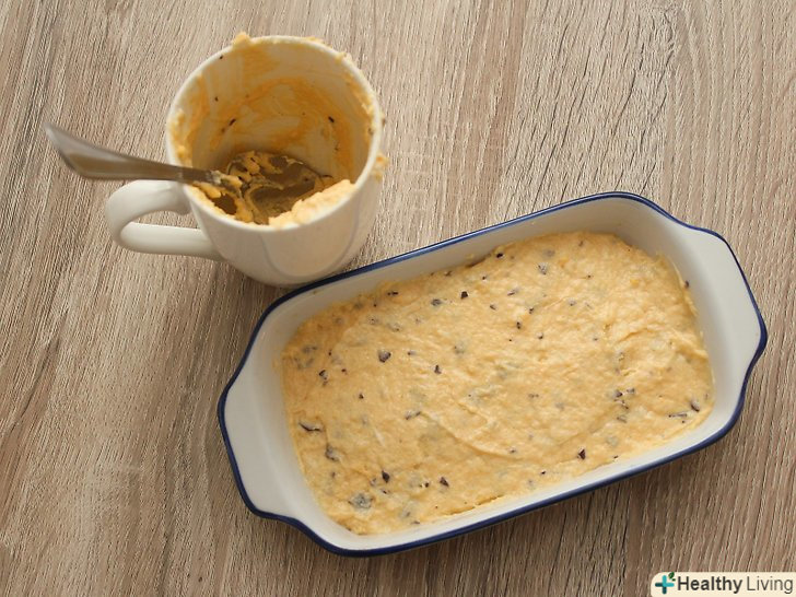 Розподіліть тісто на деку.змастіть маслом і посипте борошном блюдо для випікання розміром 20 см на 20 см, яке безпечно використовувати в мікрохвильовці. Покладіть тісто на блюдо і розрівняйте його гумовою лопаткою або ложкою. Висипте ½ склянки шоколадної крихти поверх тесту.[14]- Можна також змастити блюдо для випічки антипригарним спреєм.