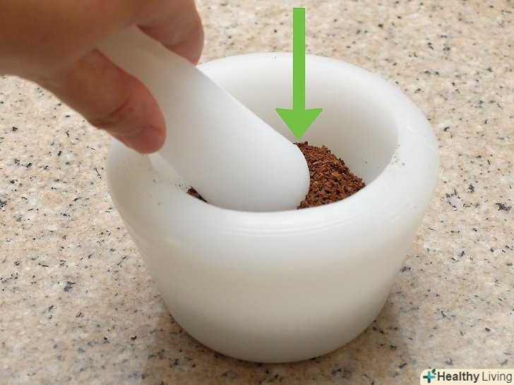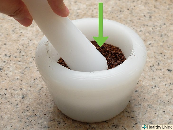 Подрібніть боби.це можна зробити молотком і рушником, але ви також можете використовувати ступку або товчевий товкач. Після цього подрібніть боби в чистій кавомолці або зробіть це за допомогою ступки.- Рекомендується використовувати перцемолку на другому етапі подрібнення, так як буде непросто дрібно подрібнити боби в ступці. Але якщо немає можливості використовувати перцемолку, це також можна зробити за допомогою ступки.