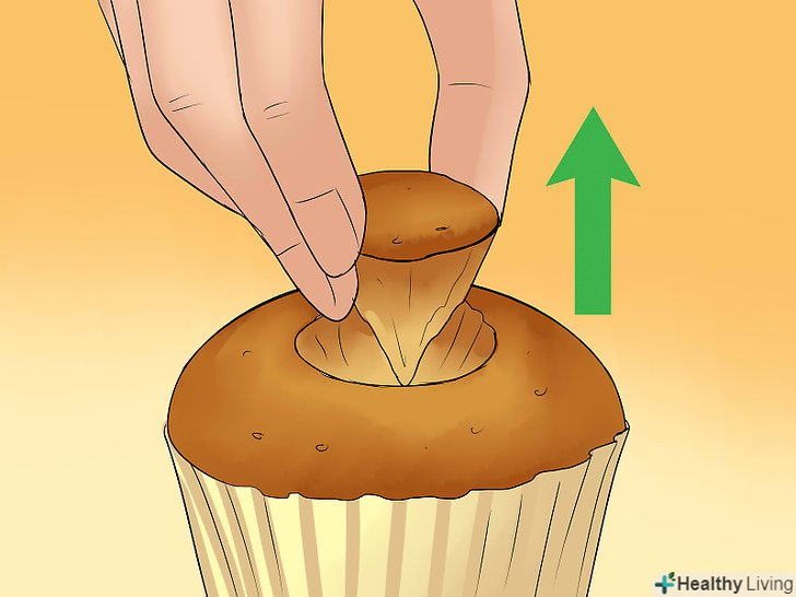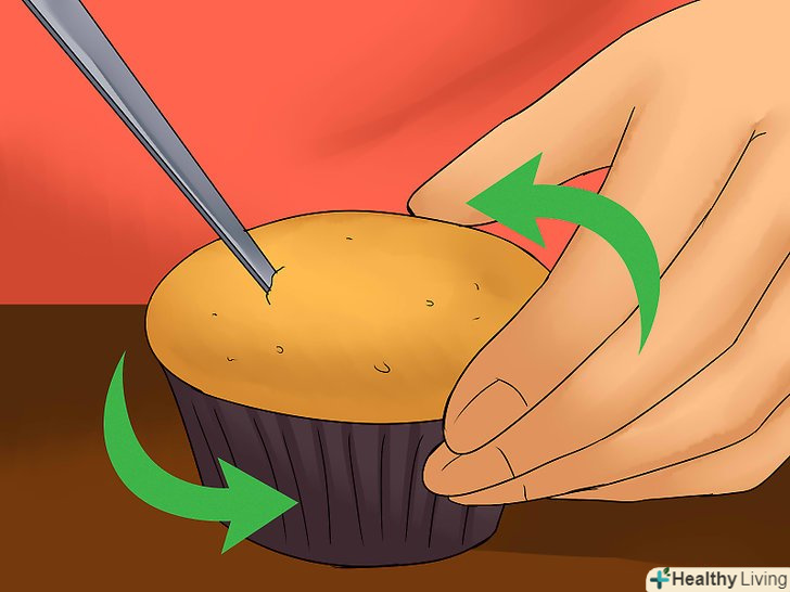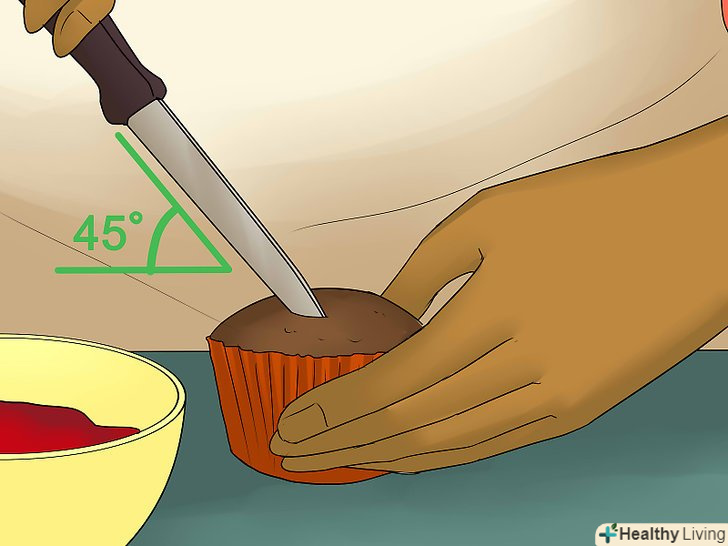 Проткніть під кутом верхівку кексу ножем для фруктів.розташуйте лезо таким чином, щоб плоска сторона була спрямована до краю кексу. Нахиліть його під кутом 45 градусів по відношенню до кексу.[5]- Не втикайте лезо занадто глибоко в кекс, інакше начинка просочиться крізь його дно.