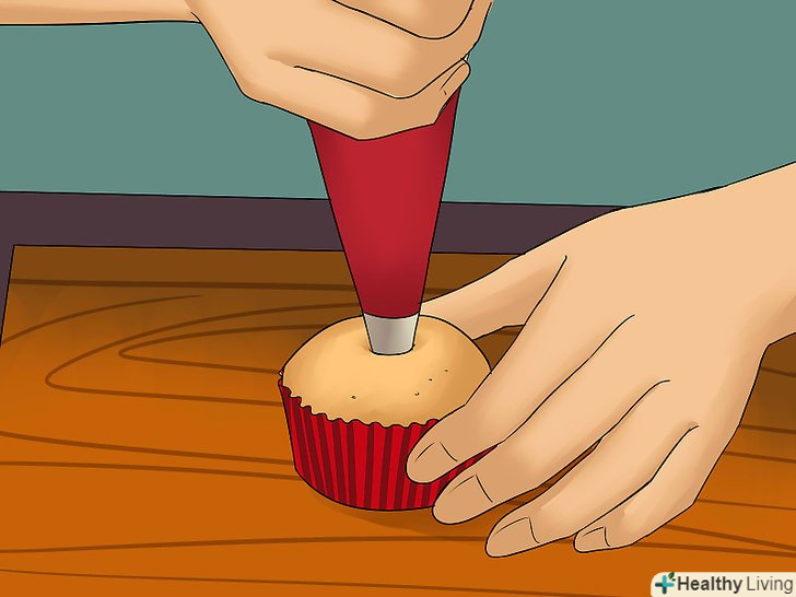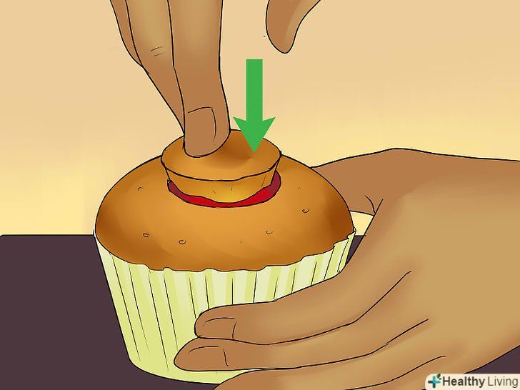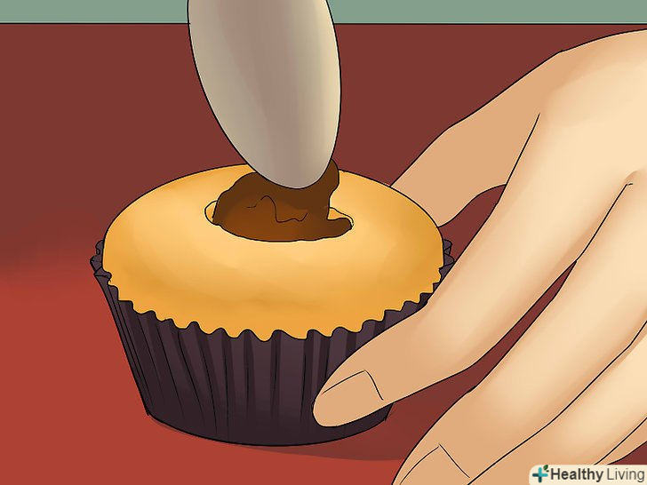 Додайте одну столову ложку обраної начинки в середину кожного кексу.Повидло або желе підійдуть найкраще. Також можна використовувати розтоплений шоколад. Збиті вершки або глазур використовувати не рекомендується, оскільки вони розтануть.[16]- Зазначена кількість начинки призначена для кексів стандартного розміру. Якщо ви робите міні-кекси, досить взяти половину чайної ложки начинки.