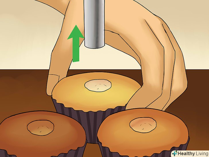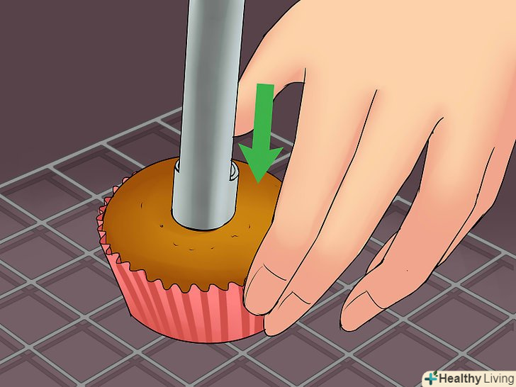 Застроміть ніж для видалення серцевини з яблук строго по центру кексу.замість спеціального ножа можна використовувати відокремлювач м'якоті. Якщо ви все-таки вирішили використовувати ніж для видалення серцевини, дотримуйтесь обережності і не вставляйте його занадто глибоко, інакше начинка витече назовні через дно кексу.[12]
