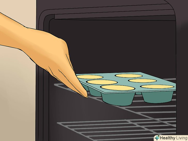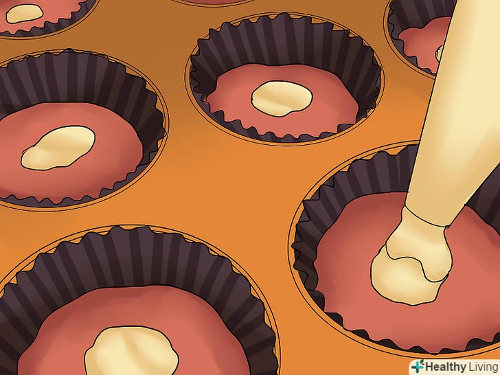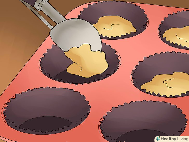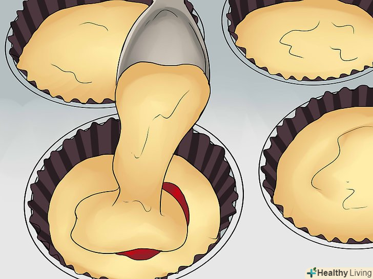 Додайте ще трохи тіста в формочки для кексів.додайте достатню кількість тіста, щоб формочки були заповнені на дві третини або три чверті. Не додавайте занадто багато, інакше кекси розтечуться.[17]