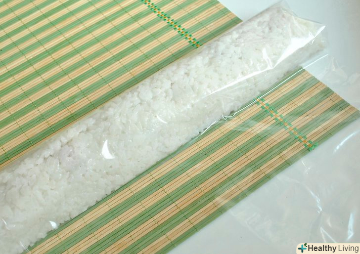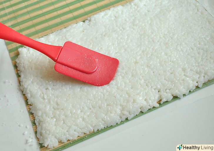 Розподіліть рис по харчовій плівці.викладіть деяку кількість рису і рівномірно розподіліть його у формі прямокутника. Робити це можна ложкою або руками.