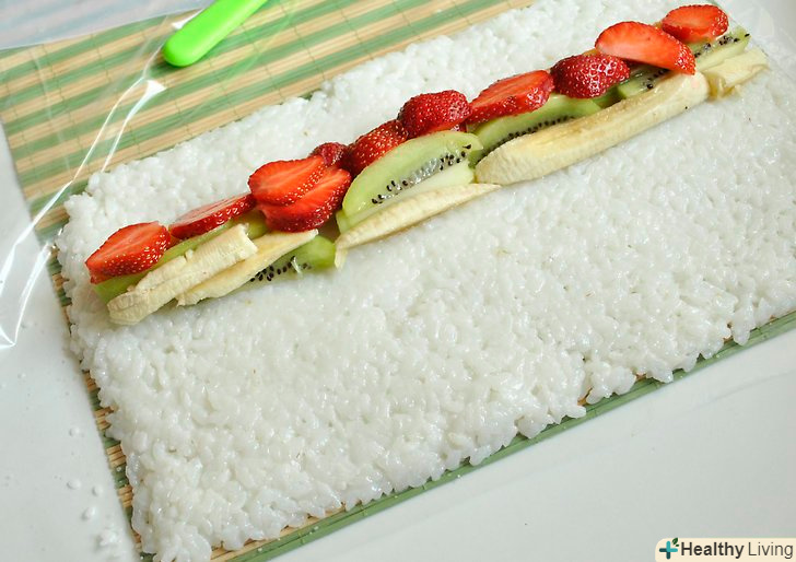 Наріжте фрукти.візьміть ніж і наріжте фрукти довгими брусочками - в точності так само, як нарізають начинку для звичайних суші.