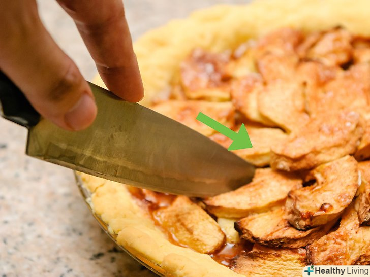 Дістаньте пиріг з духовки.коли весь пиріг підрум'яниться і стане золотисто-коричневим, вийміть його з духовки. Проткніть центр пирога ножем, щоб перевірити, чи готова начинка. Якщо натрапите ножем на тверді шматки, поставте пиріг назад в духовку при меншій температурі. При необхідності знову обкласти краю пирога фольгою.- Коли пиріг як слід запечеться, дайте йому злегка охолонути, перш ніж подавати на стіл.