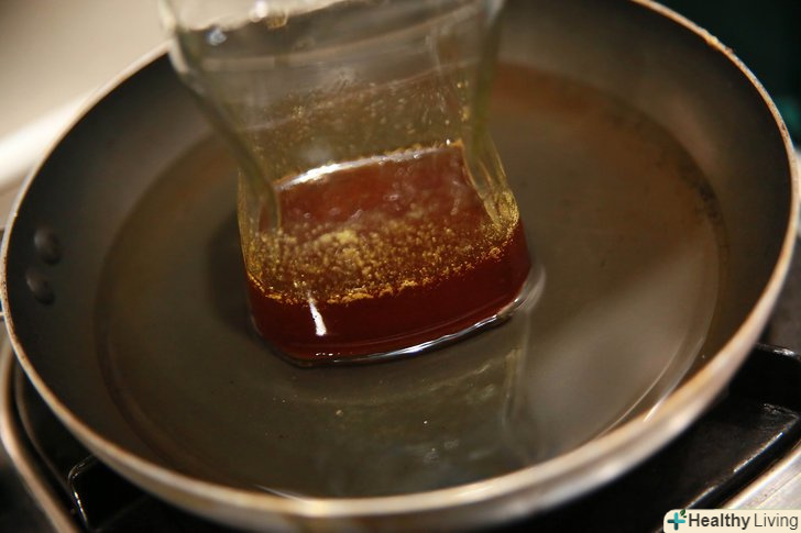 - Занурте кристалізований мед в теплу воду. Відкрийте банку меду і обережно поставте мед на водяну баню. Дочекайтеся, поки тепла вода не почне руйнувати кристали глюкози на бічних стінках банки з медом.