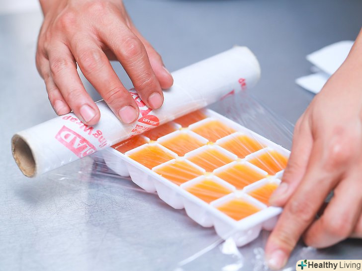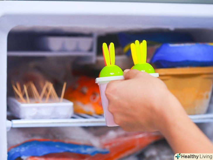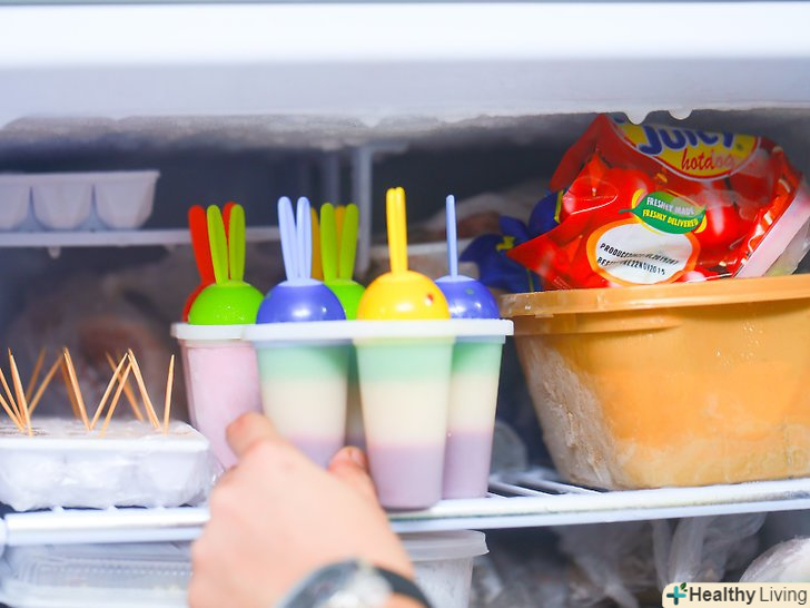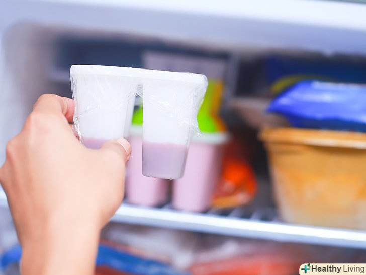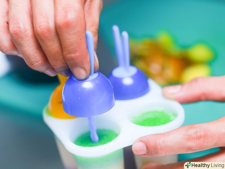 Поставте форми в морозильну камеру і почекайте, поки суміш замерзне.це займе близько 1,5-2 годин.[20] накрийте форми поліетиленовою плівкою або алюмінієвою фольгою. Якщо форма йде в комплекті з кришкою, яка застосовується одночасно і як паличка для льоду, поки не використовуйте її. Ви не зможете додати інші два шари, якщо перший шар замерзне навколо палички.