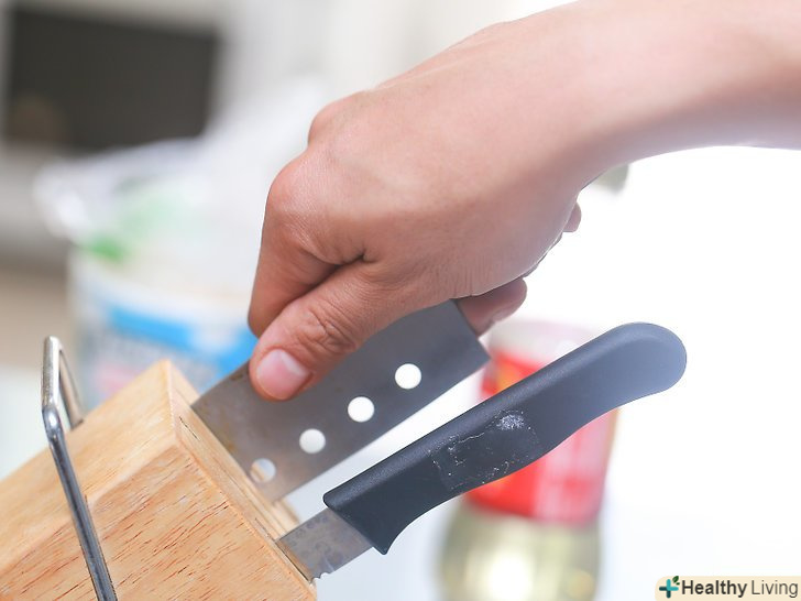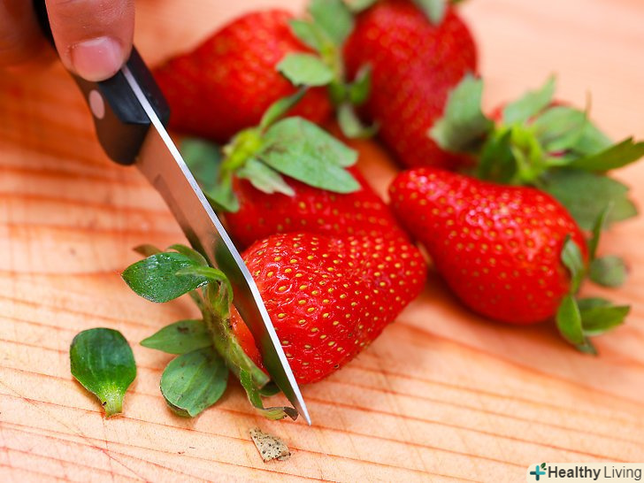 Необхідно попередньоПідготувати полуницю.бажано довірити цей процес дорослій людині, яка зможе безпечно використовувати ніж. Візьміть невеликий, гострий ніж (ніж для фруктів підійде найкраще) і тримайте його домінуючою рукою за ручку на відстані близько 2 сантиметрів від початку леза. Візьміть полуницю в другу руку.[6]