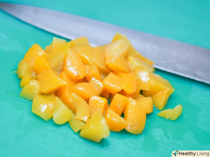Дістаньте з персиків кісточки і розріжте м'якоть на дрібні шматочки.так буде простіше перемолоти фрукти в блендері. За допомогою ножа для овочів робіть розріз по колу фрукта, поки його лезо не повернеться у вихідну точку.[21]- Ведіть ніж по колу персика, торкаючись при цьому лезом кісточки, щоб розрізати фрукт навпіл.[22]