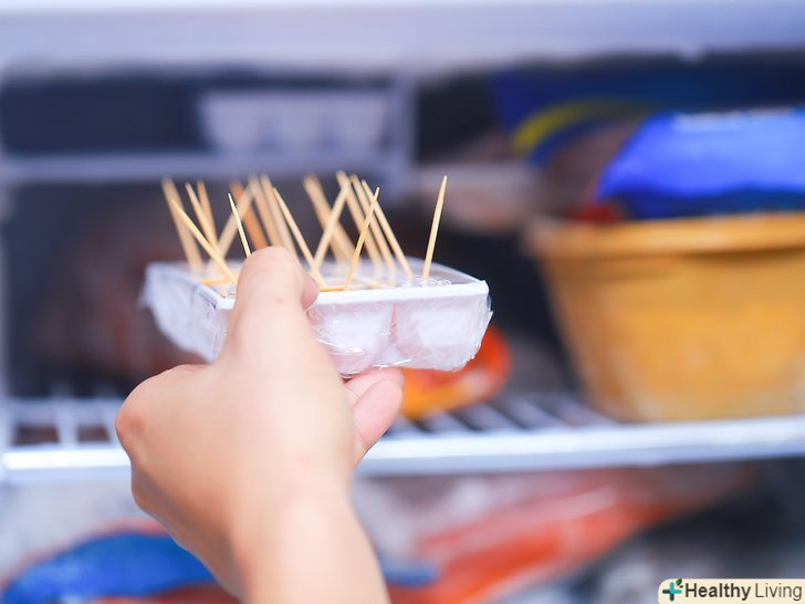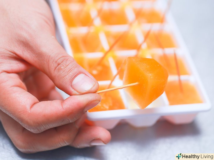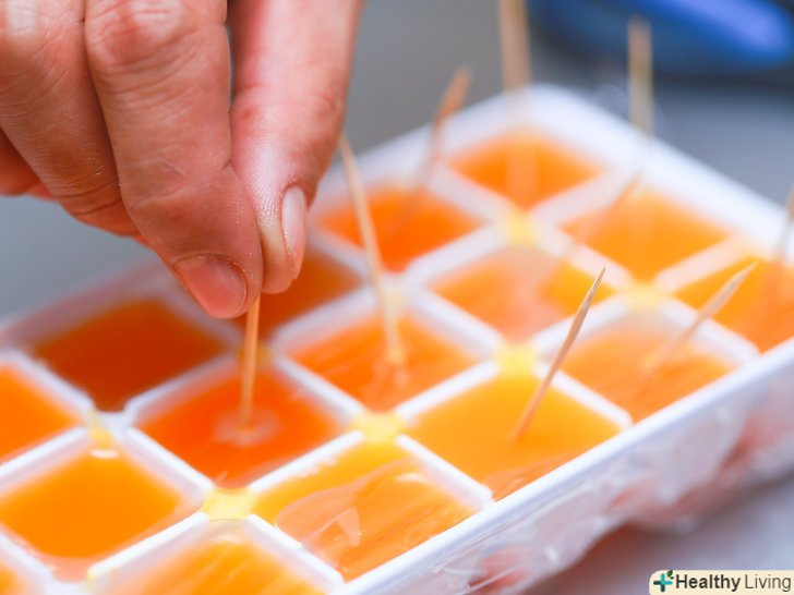 Поставте лоток у морозильну камеру.щоб льодяники повністю замерзли, залиште їх в холоді на всю ніч.[5] якщо у вашому розпорядженні немає такої кількості часу, перевірте їх через 2-3 години.- Спробуйте несильно похитати зубочистку з боку в бік, щоб зрозуміти, замерз сік чи ні.