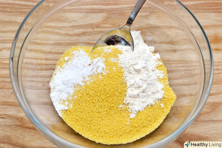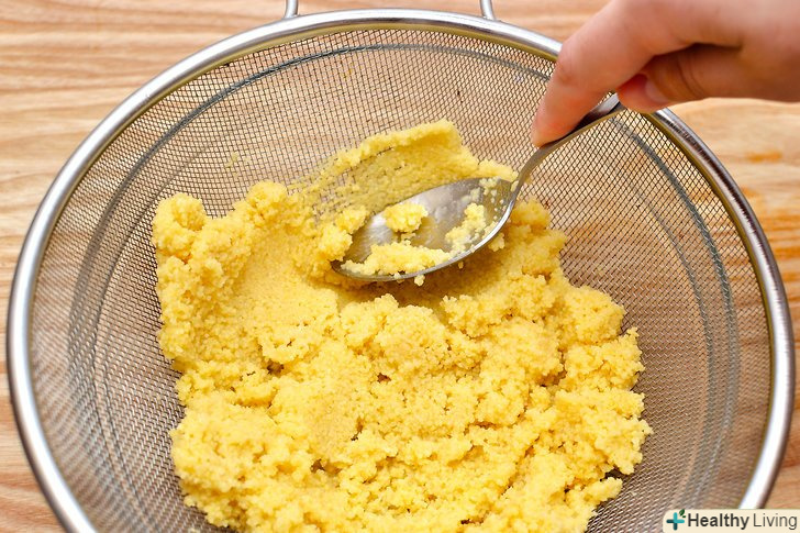 Перемішайте ретельно всі інгредієнти і пропустіть суміш через сито.Розбийте ложкою все великі грудки манки, щоб вони не пройшли через сито.