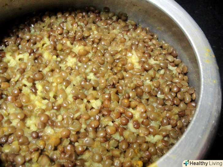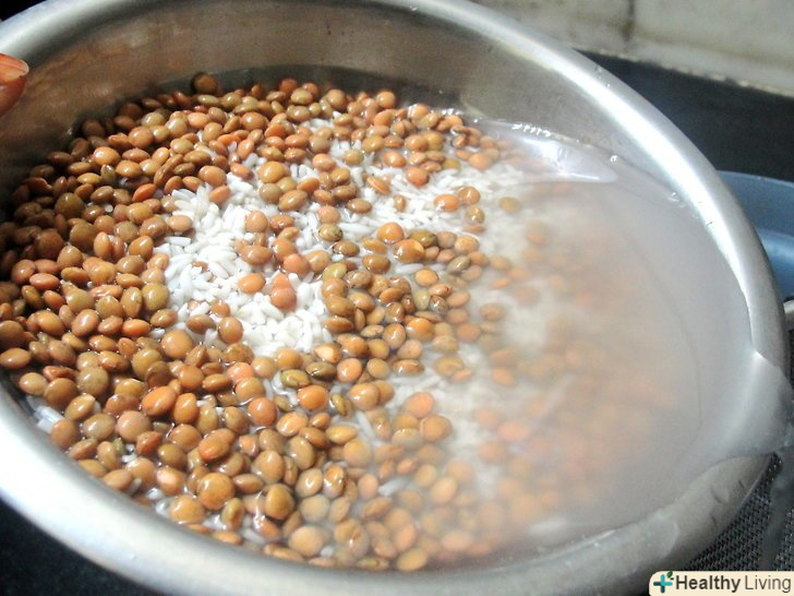 Покладіть в скороварку рис, сочевицю, куркуму і сіль і залийте 3-4 склянками води.