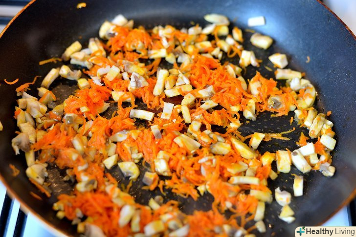 Додайте 1/3 склянки нарізаних грибів і 2 подрібнених зубчики часнику.готуйте їх з морквою протягом однієї хвилини.