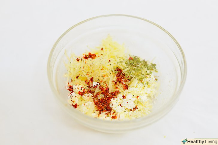 Зробіть начинку. щоб зробити сирну суміш, перемішайте у великій мисці 1 склянку тертого сиру моцарелла, 2/3 склянки сиру Рікотта, 1/4 склянки молока, 1/4 ч.л. солі, 1/2 ч. л. меленого чорного перцю, 1/4 ч. л. пластівців червоного перцю і 1 ч. л. сушеного орегано. Змішуйте до отримання однорідної маси.