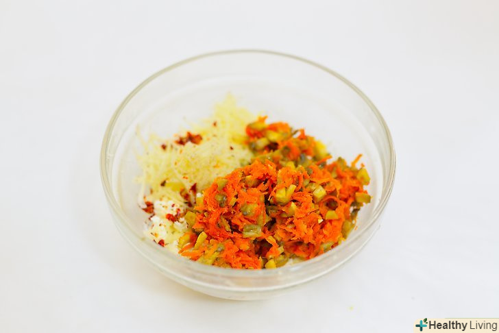 Об'єднайте овочеву суміш з сирною.перемішайте моркву і гриби з сирною сумішшю. При необхідності додайте трохи більше молока, якщо суміш занадто густа.