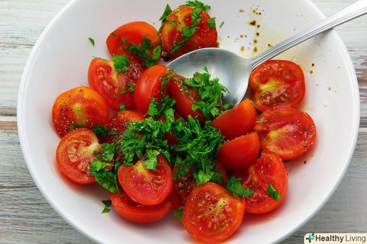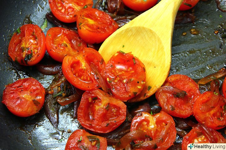 Змішайте решту інгредієнтів.поки цибуля смажиться на сковороді, в мисці змішайте решту інгредієнтів. Змішайте 20-30 половинок маленьких рожевих помідорів, 1/2 склянки сухого білого вина, 2 чайні ложки вустерського соусу, 3 столові ложки нарізаної зелені, 2 чайні ложки коричневого цукру, 1 чайну ложку солі і трохи меленого перцю. Добре перемішайте вищезгадані інгредієнти, використовуючи ложку або зробіть це руками.[13]- Будьте обережні, не роздушіть помідори. Вони повинні залишатися цілими у вашому блюді.
