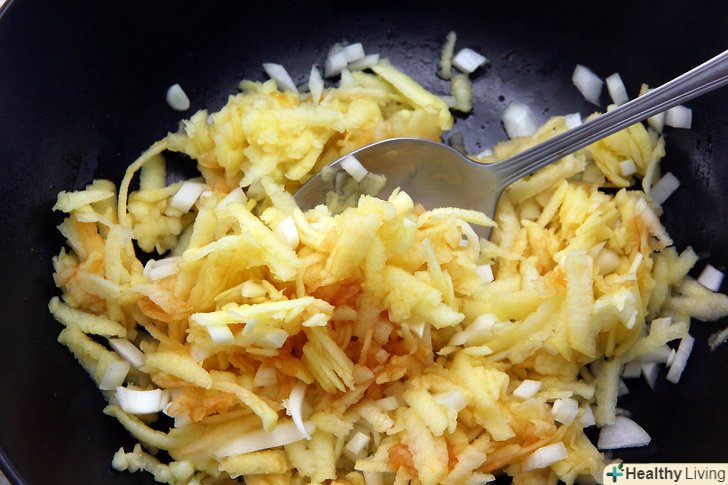 Підготуйте основні інгредієнти, необхідні для приготування соусу.гострим ножем зніміть з яблука шкірку і натріть його на тертці. Дрібно наріжте цибулю і роздушіть кілька зубчиків часнику. Змішайте яблуко, цибулю і часник в мисці. Добре перемішайте вищезгадані інгредієнти.[17]- Слідкуйте за тим, щоб суміш не придбала кашоподібну консистенцію. Соус повинен бути густим. Однак стежте за тим, щоб він не перетворився на кетчуп.