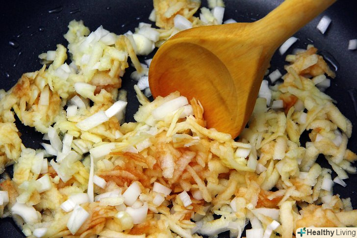 Увімкніть плиту на середній вогонь.поставте сковороду на плиту і налийте в неї приблизно дві столові ложки оливкової олії. Коли сковорода нагріється, перекладіть в неї вищезгадані інгредієнти. Добре перемішайте, щоб тепло розподілилося більш рівномірно.[18]- Якщо ви бачите, що одержима сковороди починає прилипати до дна, додайте більше оливкової олії.