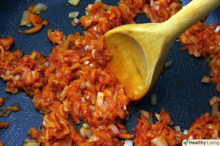Продовжуйте готувати соус.зменшіть вогонь до мінімуму. Продовжуйте готувати, не забуваючи постійно помішувати інгредієнти. Через 10 хвилин вимкніть плиту. Поставте сковороду в безпечне місце остигати.[20]- Додайте оливкову олію, якщо бачите, що вміст сковороди прилипає до дна.