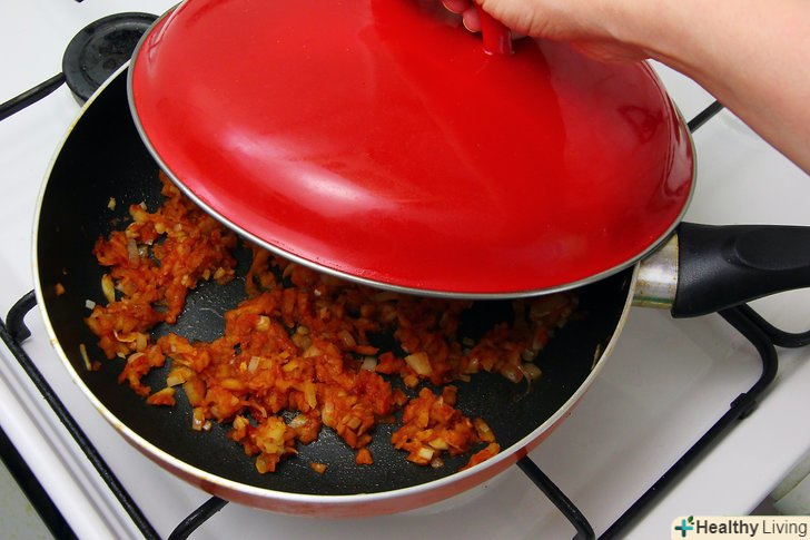 Додайте приготовлену суміш в сковороду з цибулею.як тільки цибуля стане прозорим, додайте приготовлену суміш. Ложкою перемішайте всі інгредієнти. Накрийте сковороду кришкою. Зменшіть вогонь до мінімуму.[14]- Якщо вміст сковороди почне прилипати до дна, додайте більше оливкової олії.
