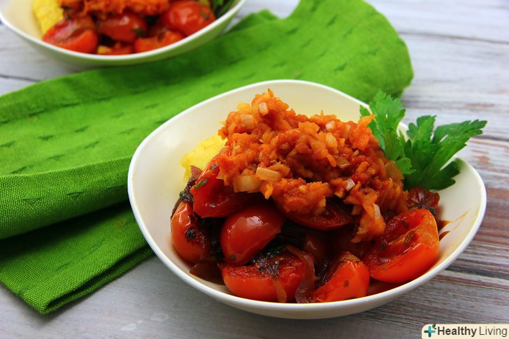 Продовжуйте готувати гарнір.робіть це протягом приблизно однієї години. Кожні 10 хвилин добре перемішуйте інгредієнти. Зробивши це, швидко закривайте сковороду кришкою. Через годину вимкніть вогонь.[15]- Слідкуйте за тим, щоб Ваше блюдо не підгоріло. Особливо стежте за станом помідорів. Якщо ви бачите, що страва готова, вимкніть вогонь.