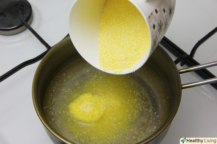 Додайте кукурудзяну муку у воду.вам знадобиться 2-3 чашки кукурудзяного борошна. Додайте кукурудзяну муку в киплячу воду. Накрийте каструлю кришкою. Зменшіть вогонь до середньої температури.[5]- Якщо ви готуєте на газовій плиті, зменшіть вогонь до середньої температури.