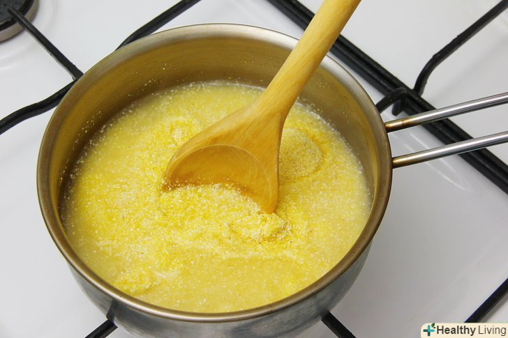 - Великою дерев'яною ложкою постійно помішуйте кукурудзяну муку, щоб уникнути утворення грудок.
