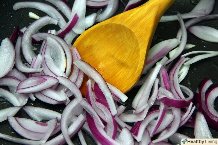 Наріжте дві головки червоної цибулі.покладіть цибулю в сковороду, в яку попередньо налийте дві столові ложки оливкової олії. Поставте сковороду на плиту і включіть середній вогонь. Обсмажуйте цибулю, поки він не стане прозорим. Постійно помішуйте, завдяки чому тепло буде розподілятися рівномірно.[12]- Можна використовувати солодкий білий лук замість червоної цибулі.