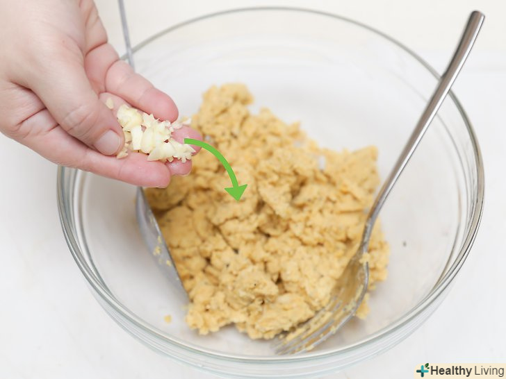Додайте один подрібнений зубчик часнику і добре перемішайте.використовуйте дерев'яну ложку, щоб ретельно перемішати всі інгредієнти разом. Переконайтеся, що часник рівномірно розподілений по всьому тесту. Після того як ви добре перемішаєте інгредієнти, зробіть маленьке поглиблення у верхній частині тесту для води, яку ви додасте в наступному кроці.