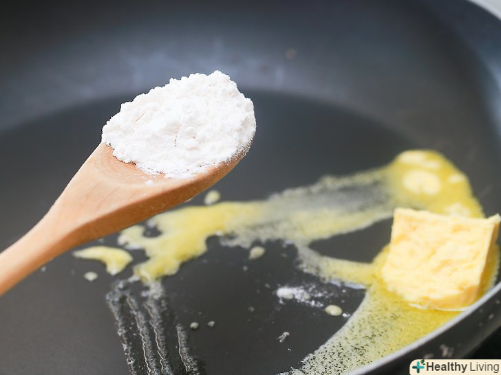 Додайте борошно.введіть борошно в розтоплене масло. Лопаткою якнайкраще розмішайте борошно з маслом.- Після змішування борошно і масло повинні набрякнути.