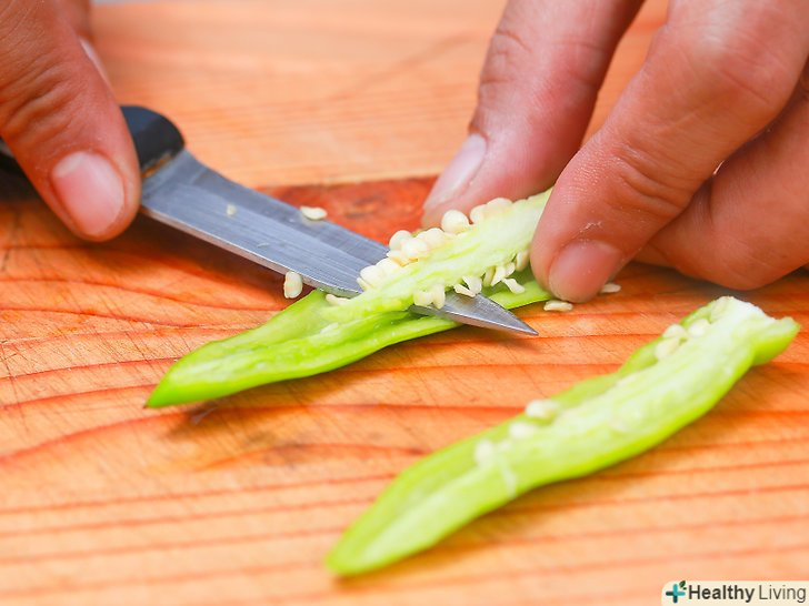Видаліть насіння зі свіжого і сушеного чилійського перцю.якщо рецепт передбачає застосування цілого перцю чилі, ви повинні видалити всі стебла, перегородки і насіння. Використовуйте для цього гострий маленький ніж.- Після роботи з чилійським перцем добре вимийте руки з милом і водою. Якщо ви не помиєте руки, ви можете випадково протерти очі руками, що викличе дуже сильне печіння.