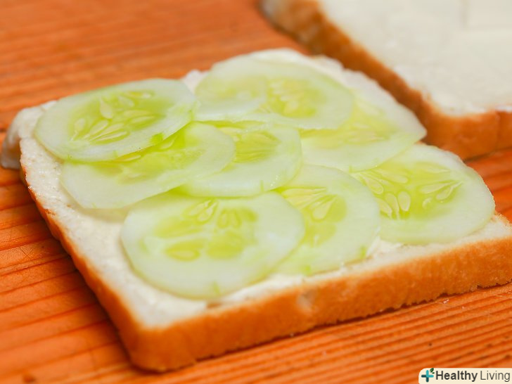 Зніміть шкірку зі свіжого вимитого огірка і наріжте його кружечками.щоб приготувати сендвіч за традиційним рецептом, вам знадобляться тонкі, хрусткі скибочки огірка без шкірки. Скористайтеся овощечисткой або гострим ножем, щоб зняти шкірку з огірка.- Якщо хочете, можна нарізати скибочки товстіший або залишити огірок неочищеним. Шкірочка не завадить вам приготувати сендвіч, проте її текстура трохи щільніше, ніж у огіркової м'якоті.
