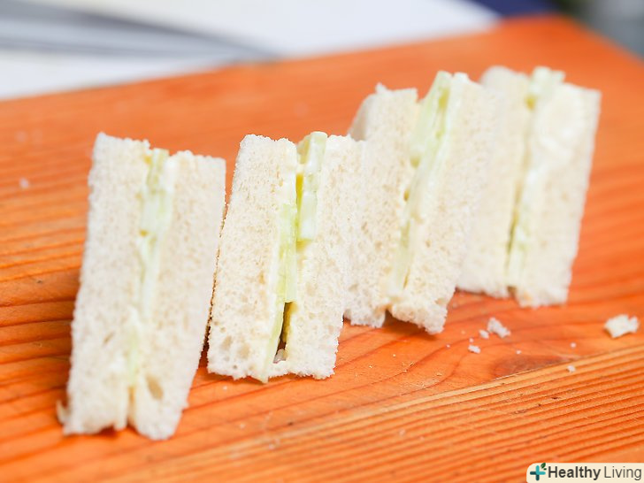 Зріжте скоринки і наріжте сендвіч на маленькі шматочки.не існує єдиного "правильного" способу поїдання огіркового сендвіча. Однак, якщо ви хочете сервірувати стіл в традиційному англійському стилі, майте на увазі, що у Великобританії прийнято зрізати з готового сендвіча хлібні скоринки і подавати його, нарізаним «на один укус» квадратиками, трикутниками або смужками. Так що розріжте сендвіч на шматочки (або залиште цілим) і поспішайте до столу.[3]- Якщо ви чекаєте гостей, приготуйте більше сендвічів, послідовно повторюючи всі вищеописані кроки. При необхідності наріжте більше огірків і приготуйте додаткову порцію сирної намазки.