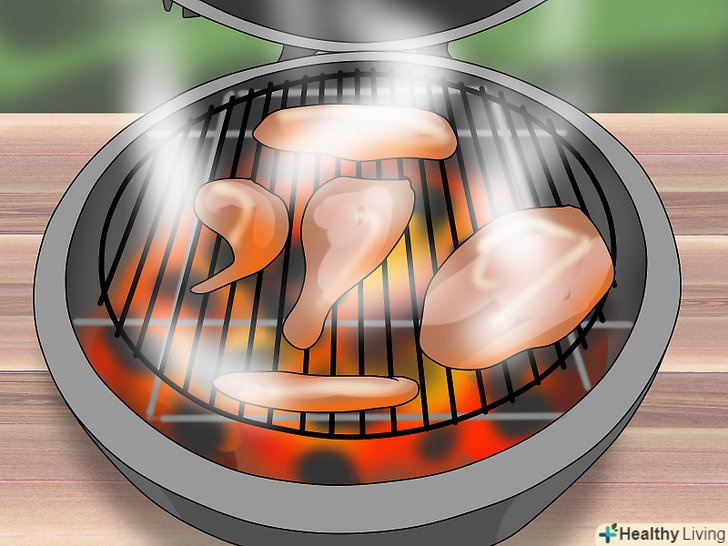Приготуйте м'ясо.необхідно покласти м'ясо на решітку шкіркою вгору, щоб підсушити її, а потім перевернути зворотною стороною. Залиште м'ясо на чотири-п'ять хвилин, перш ніж знову перевернути. Готуйте ще п'ять хвилин.[10]- Можна надати додатковий аромат м'яса, якщо полити кожен шматочок ложкою яблучного оцту за дві хвилини до того, як буде пора вимкнути гриль.[11]
