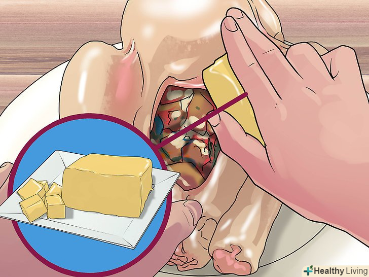 Нафаршируйте птицю.як і у випадку з індичкою, можна начинити фазана або залишити його без начинки. Начинка зробить смак птиці різноманітним і збереже соковитість м'яса.- Найбільш популярною начинкою для фазана є подрібнену цибулю і нарізані яблука. Використовуйте цілу цибулину і яблуко, або ж тільки половину кожного інгредієнта.
