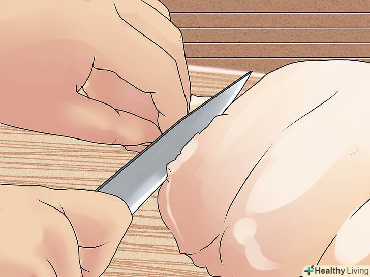 Наріжте м'ясо.щоб приготувати птицю на грилі, візьміть вимоченого в сольовому розчині фазана і розріжте на вісім частин. У вас вийде два крила, два філе, два стегна і дві ноги. Крім вимоченої птиці вам також знадобиться обвалочний ніж. Перед початком оброблення покладіть фазана на рівну поверхню грудиною вгору.[8]- Відріжте ноги і стегна птиці. За допомогою ножа відріжте м'ясо в тих місцях, де вони з'єднуються з тулубом. Руками відтягніть в різні боки стегна і ноги від тушки. Потім покладіть птицю на бік і ножем розріжте суглоби.
